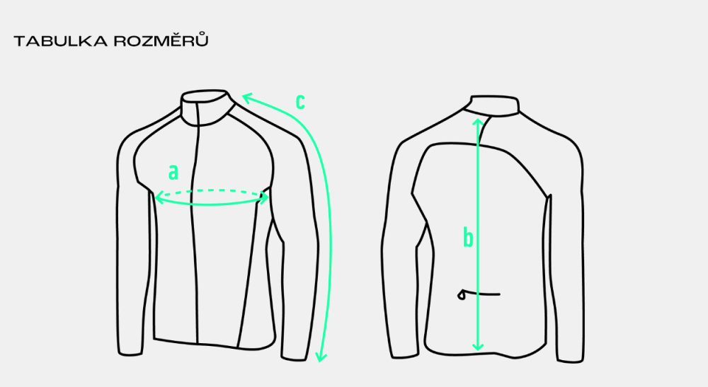 | Velikost | A: hrudník (cm) | B: délka (cm) | C: rukáv (cm) |